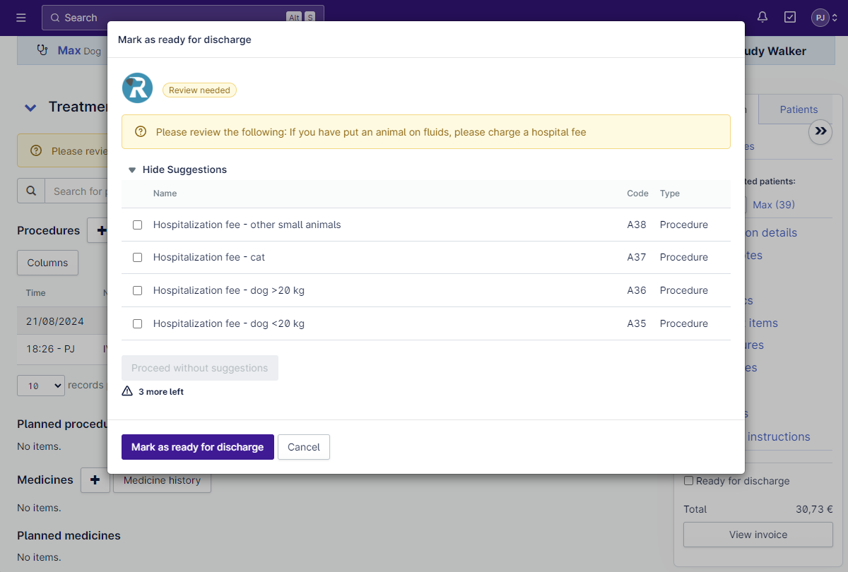 When a vet completes a consultation in Provet Cloud, and marks it for discharge, Profit Retriever steps in. It looks at what products and services they have added and runs a series of checks to see what else they may have missed.